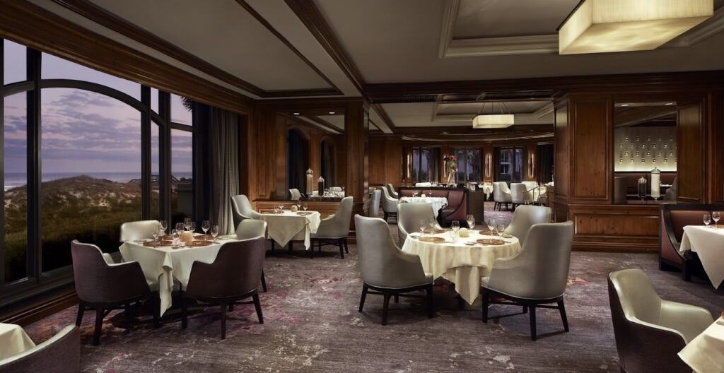 Inside, floor-to-ceiling windows showcase the rolling dunes and Atlantic Ocean. White linen-covered tables dot the dining area, offering unobstructed views. The alabaster-lit walls and intricate oyster shell sculptures add artistic flair, further adding to the refined atmosphere.