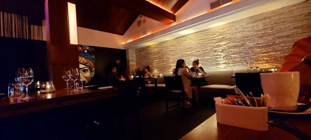 Soft lighting complements the sleek furniture and polished decor, creating an inviting vibe perfect for a romantic dinner, a celebratory meal, or a sophisticated night out.