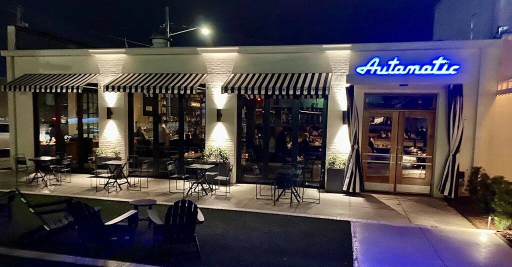 What catches the eye is the neon, Gulf-water-blue "Automatic" sign over the entrance. The 1950s-style font honors the building's former owners, while its blue hues beckon guests to explore the visionary cuisine within.