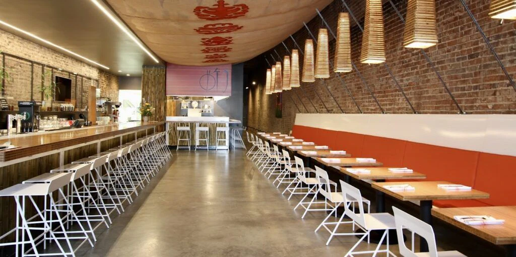 Inside, the narrow open space takes elements from the East and West to create a unique setting. For example, massive burlap rice bags tastefully adorn the ceiling, while exposed brick walls honor Birmingham's connection to the iron industry.