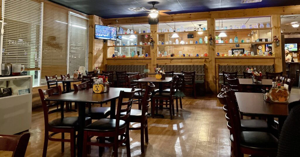 You'll spy shelves lined with vintage Mason jars and pictures on the wooden walls telling stories of the area. The bar area is separate from the dining space, where booths and tables fill the area. The setting is perfect for family gatherings, casual lunches, or dinners to reflect on exploring the Jackson Ferry Shot Tower.