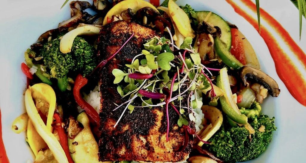 The tropical outdoor patio is al fresco dining at its best, reminiscent of being in the Caribbean or South Pacific.