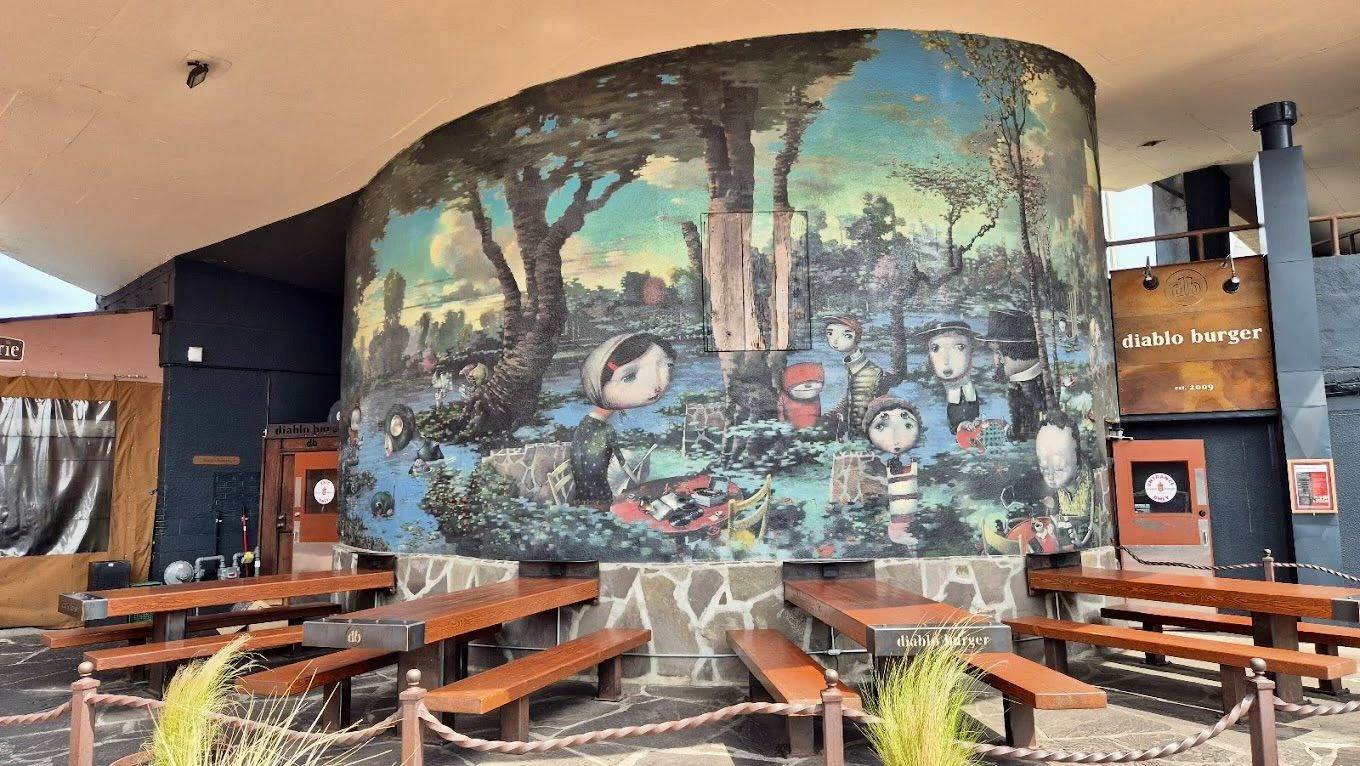 The restaurant's location in Downtown Flagstaff, in a former J.C. Penney's parking garage, stands out. The colorful mural wrapped around a curved building is captivating, setting the stage for an incredible burger experience.