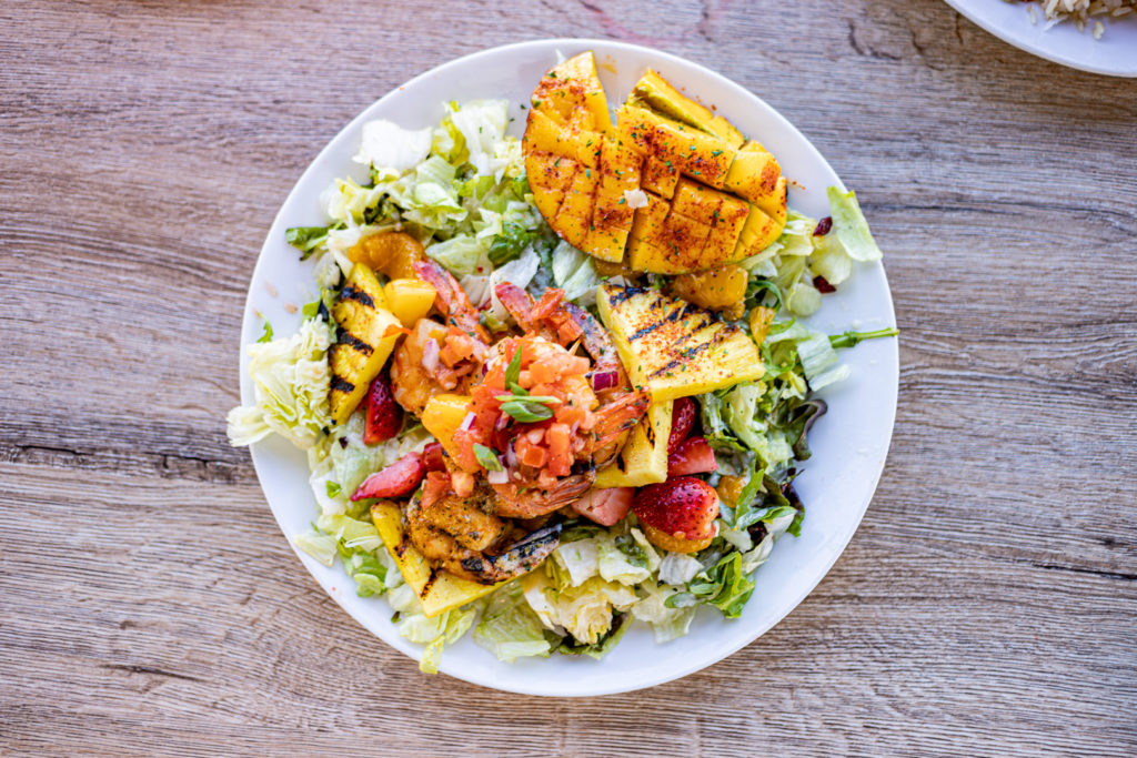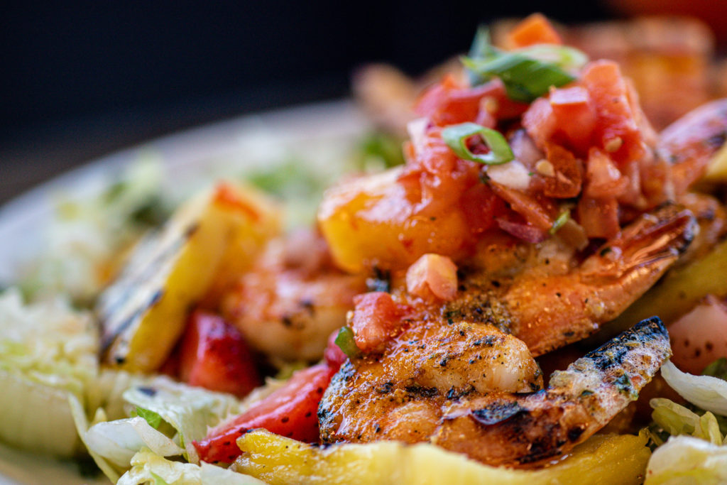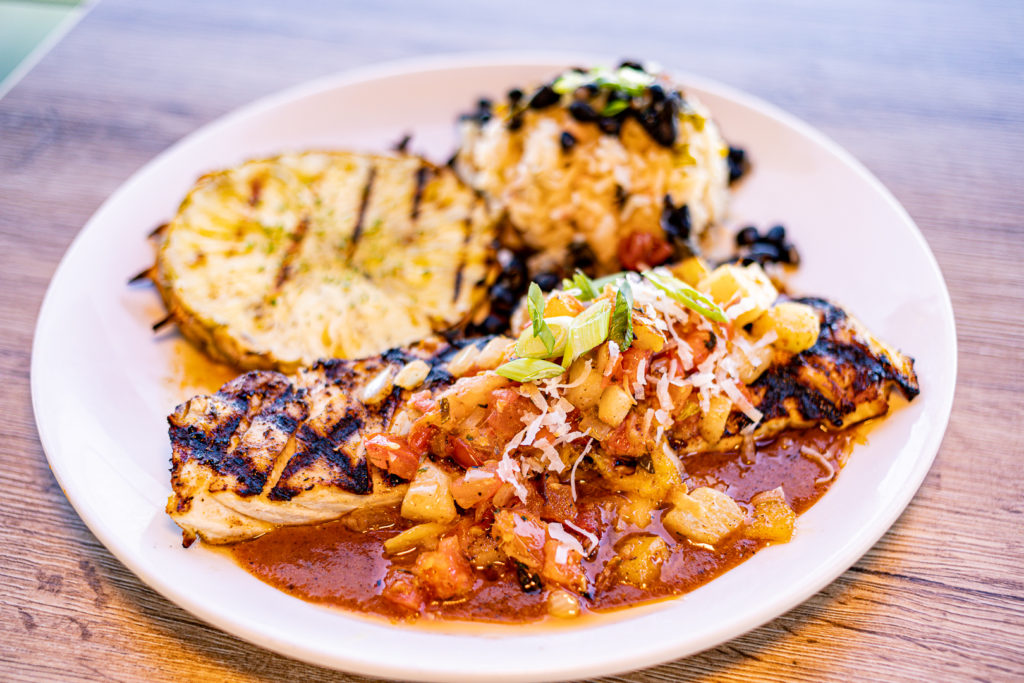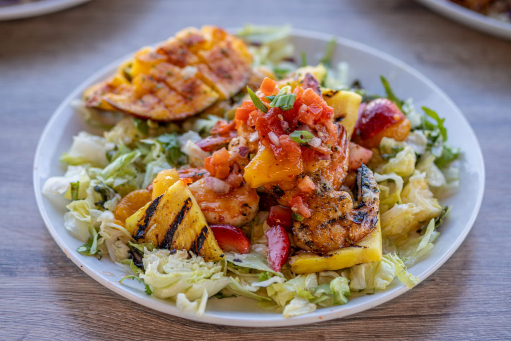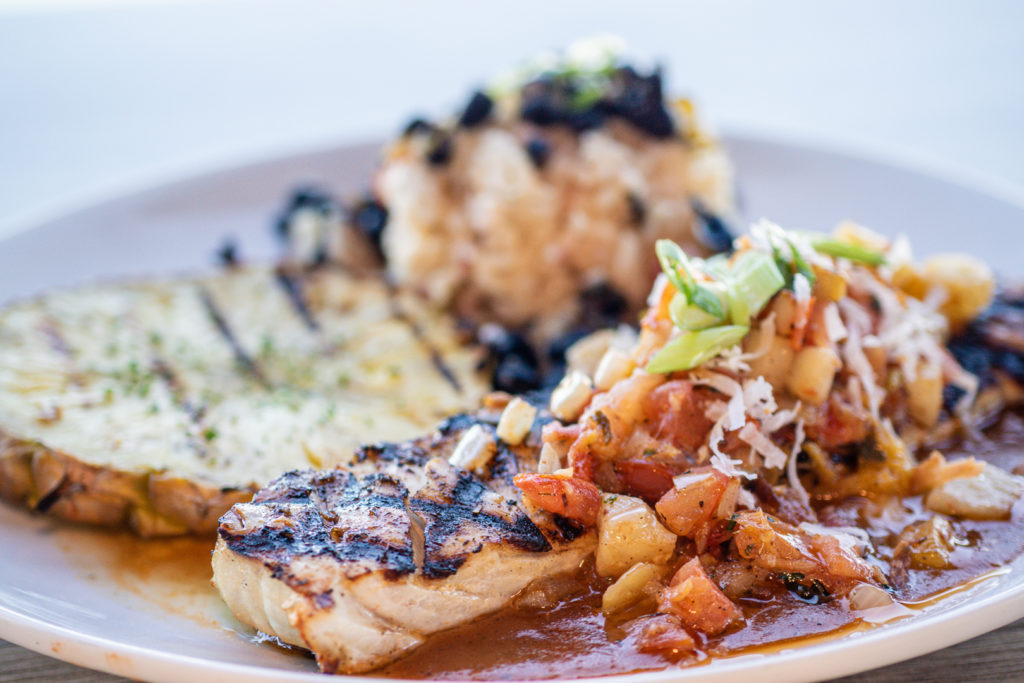 Start your meal off on the right food with a delicious seafood ceviche. The seafood in this dish includes lime juice marinated Gulf Snapper and Gulf Shrimp. In addition, orange and pineapple juice are in the mix. The final toppings include avocado, pico de gallo, cucumbers, jalapeno, and chimichurri slaw. Of course, you also get chips to dip. This colorful dish is loaded!