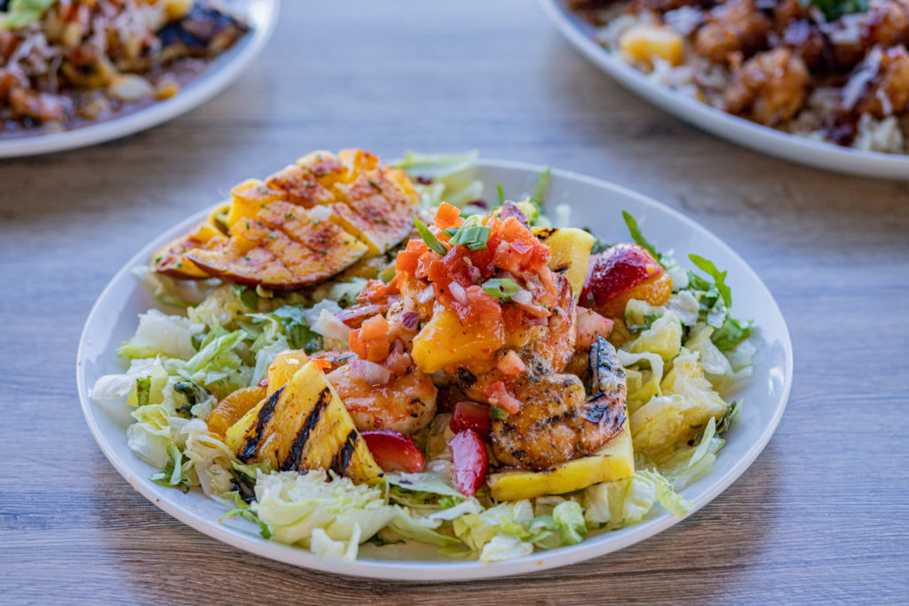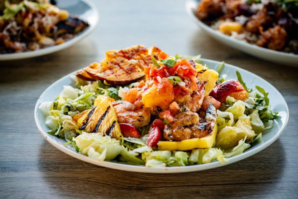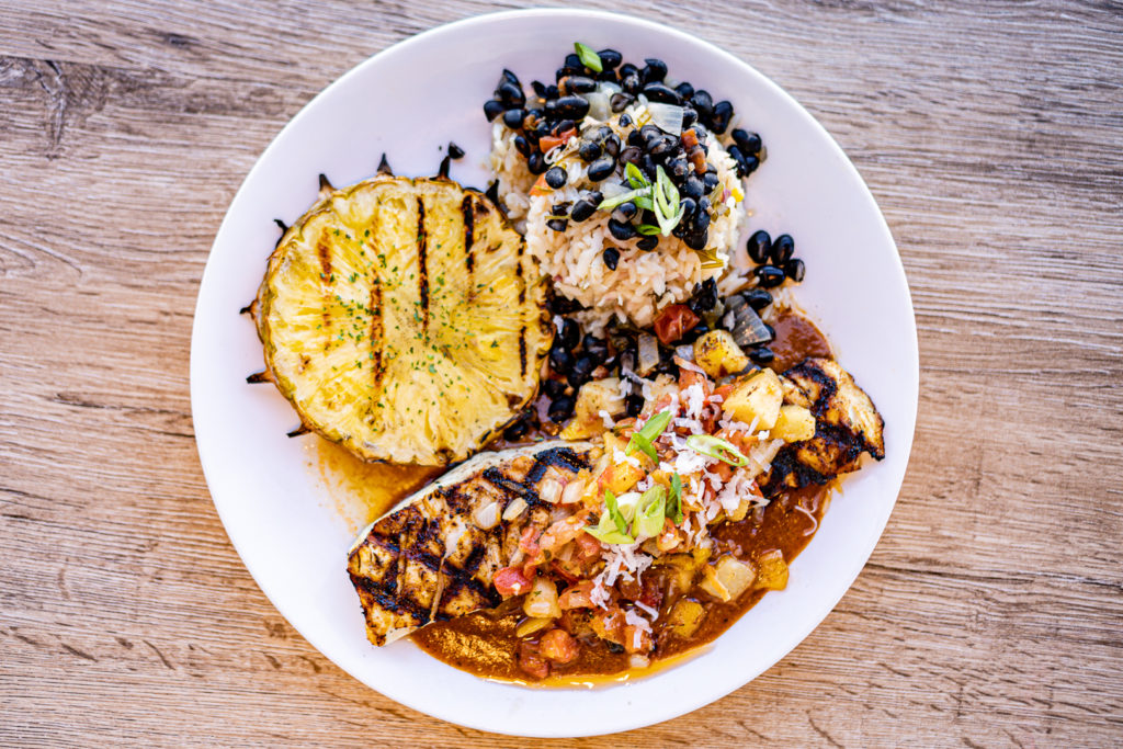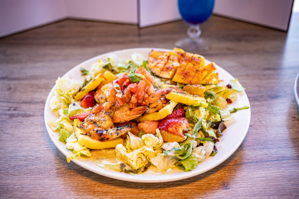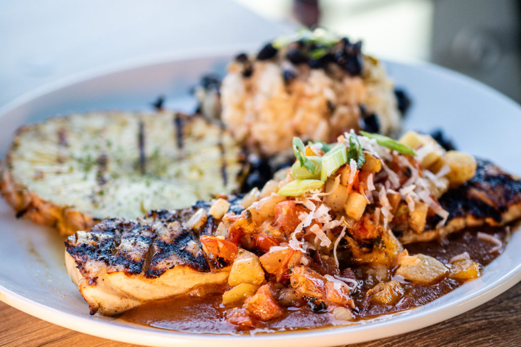 Start your meal off on the right food with a delicious seafood ceviche. The seafood in this dish includes lime juice marinated Gulf Snapper and Gulf Shrimp. In addition, orange and pineapple juice are in the mix. The final toppings include avocado, pico de gallo, cucumbers, jalapeno, and chimichurri slaw. Of course, you also get chips to dip. This colorful dish is loaded!