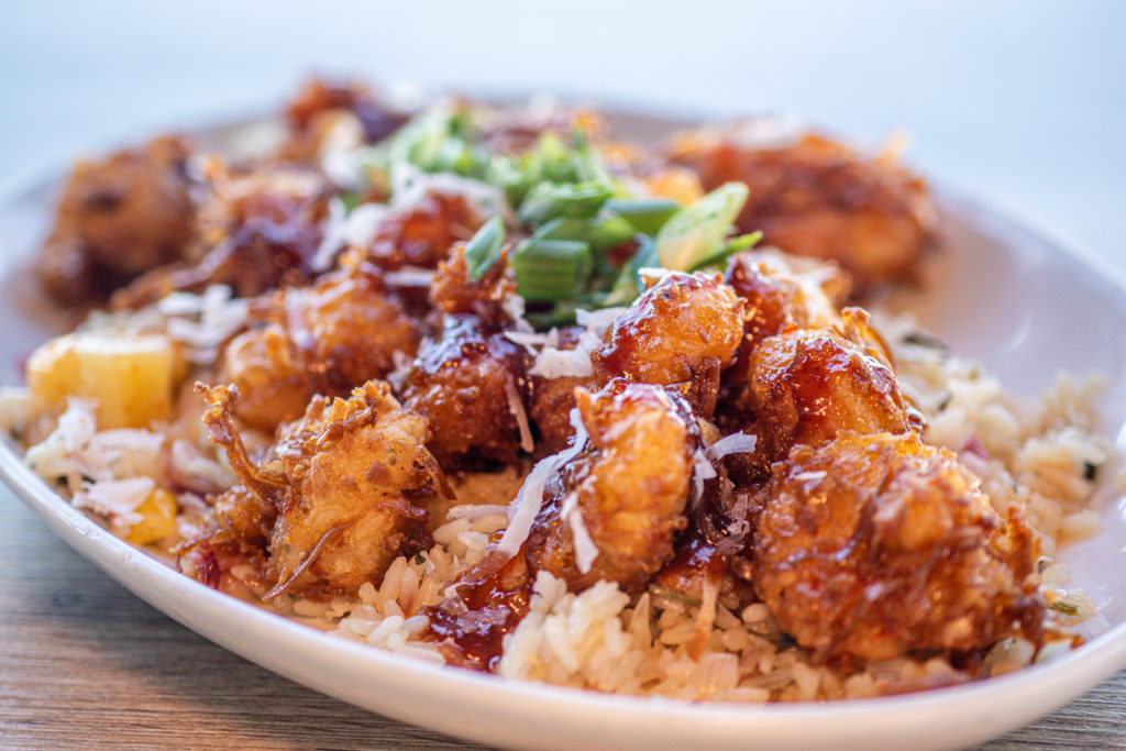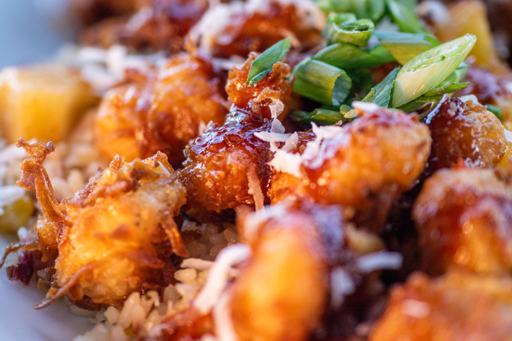 This explosive burger comes with a coconut crusted ground shrimp patty on gojujang drizzled lettuce. Additionally, the toppings include onion, pickles, grilled pineapple, and a sweet thai chili sauce. This unique burger offers the perfect sweet and tangy flavor.