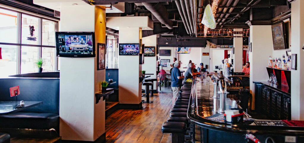 Wood bar and dining area flooring connect Utah's rugged natural features with the room's vibe. A stained concrete floor is in the section of the restaurant where the billiard tables are, adding an industrial feel to the area. The off-white walls feature sporting pictures and memorabilia that tie in with the flatscreen TVs dotting the premises.