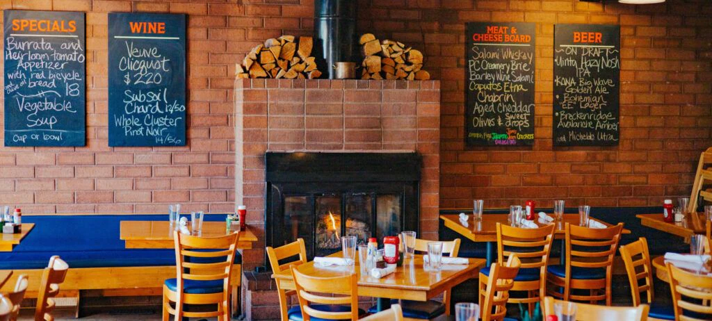 The decor combines contemporary elements with an industrial look and meshes with the town's mining history. Imagine brick walls, wood floors and tables, vaulted ceilings with wood beams, and vintage industrial lights. The fireplace not only warms up the room but adds a homey feel to the interior.