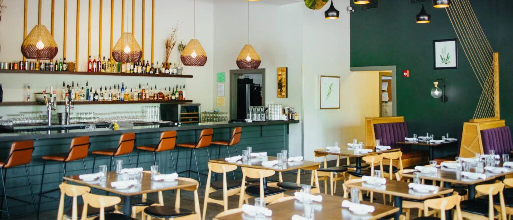 The wood dining tables with contemporary chairs and cushioned booths make for a romantic dinner or a family meal. Natural light floods the front windows, while industrial-style lighting adds a soft glow to the bar and dining room.