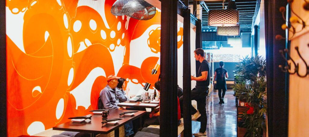 The tables are natural-looking, with swirls of grain that resemble the rings of a large, ancient tree trunk. The overall atmosphere exudes Japanese qualities that make for an amazing dining experience.