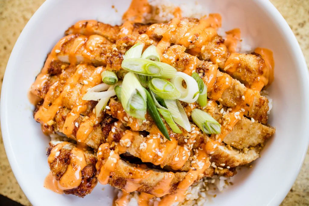 The friend chicken rice bowl is a huge meal itself with breaded and fried chicken on top of white rice. It is topped with Korean aioli (it’s spicy!) as well as teriyaki, sesame seeds, and a touch of onion. This is really a great flavor combo.