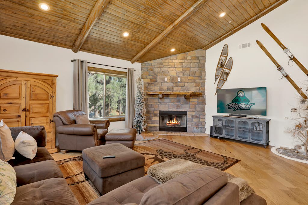Welcome to Alpine Chalet, your year-round mountain retreat perfectly suited for families, groups, and even your four-legged friends. Nestled in a quiet, tree-lined neighborhood in the heart of Big Bear, this beautiful single-story cabin offers modern comfort with the charm of a classic alpine escape. Walk to the historic Big Bear Village for dining and shopping or step onto the nearby Town Trail for a scenic hike, mountain bike ride, or ski directly to Snow Summit for easy resort access. Freshly renovated with your comfort in mind, Alpine Chalet features vaulted knotty pine ceilings, hardwood floors, and mountain-inspired decor. The open living area offers plenty of natural light, a cozy wood-burning fireplace. The fully stocked kitchen includes stainless steel appliances, a dishwasher, and all the cookware needed for home-cooked meals, plus a large log dining table and breakfast bar for gathering together.