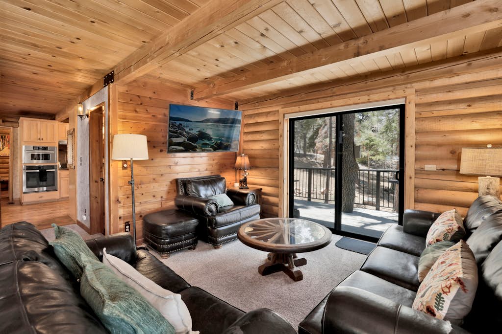 Enter your chalet where you are immediately greeted with oak wood accent walls, knotty pine beamed ceilings, and massive amounts of windows that let in the perfect balance of natural lighting and wonderful forested mountain views. The cozy living room offers leather couches sat in front of the toasty wood burning fireplace where you can warm your toes and pop on a movie on the flat screen Streaming TV with Cable and complimentary hi speed WIFI internet provided by the owners for your enjoyment. Multiple dining areas are set up with comfortable furnishings to ensure your group can enjoy your home cooked meals and holiday feasts here together at the cabin. The chef of your group will absolutely love the gourmet kitchen here at Woodland Log- gorgeous oak cabinets are stocked with cookware and utensils along with ample counter space and stainless appliances. Enjoy direct access from here out to the spacious private yard, beautiful sun deck, Charcoal BBQ, and your private hot tub under the pines where you will love soaking up your day of adventures under the stars.