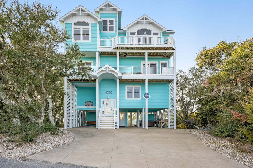 Vacation pleasures abound at the lovely, 4,500-square-foot Blue Waters, located in the soundside Kinnakeet Shores subdivision with miles of great biking and community sound access. Recently renovated, this sound-facing, custom home boasts nothing but primary bedrooms, plus numerous full bathrooms and half-baths, guaranteeing a comfortable vacation. You'll enjoy a private location with boardwalk access approximately 350 feet from the property with stunning sound views. Updates for the 2024 season include new flooring, new paint inside and out, new decking, new and comfortable bedding, and beautiful artwork throughout.