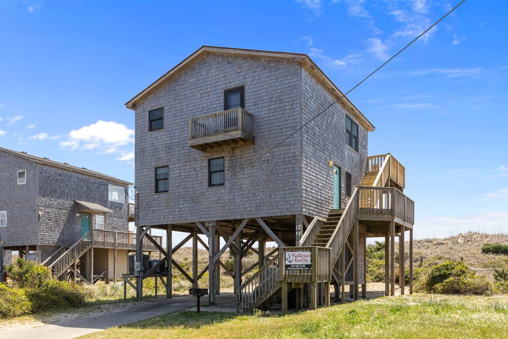 Located on Frisco's quiet oceanfront, Breakers is close to 4-wheel-drive beach access. The ground level has concrete parking, an outside shower, a carport, and super-easy ocean access. The first level has four bedrooms, two baths, and a laundry area. One bedroom is a master with a TV and DVD player. The second-story great room has a half bath, a tall cathedral ceiling, and panoramic views of the beach. Breakers has an excellent kitchen boasting a long breakfast bar and a nearby dining area. Comfortable furniture and a TV will keep Frisco vacationers entertained and happy after dark. A wide, south-facing sun deck with furniture is Breakers's greatest attraction. If you want to see the beach close up, ask for Breakers!