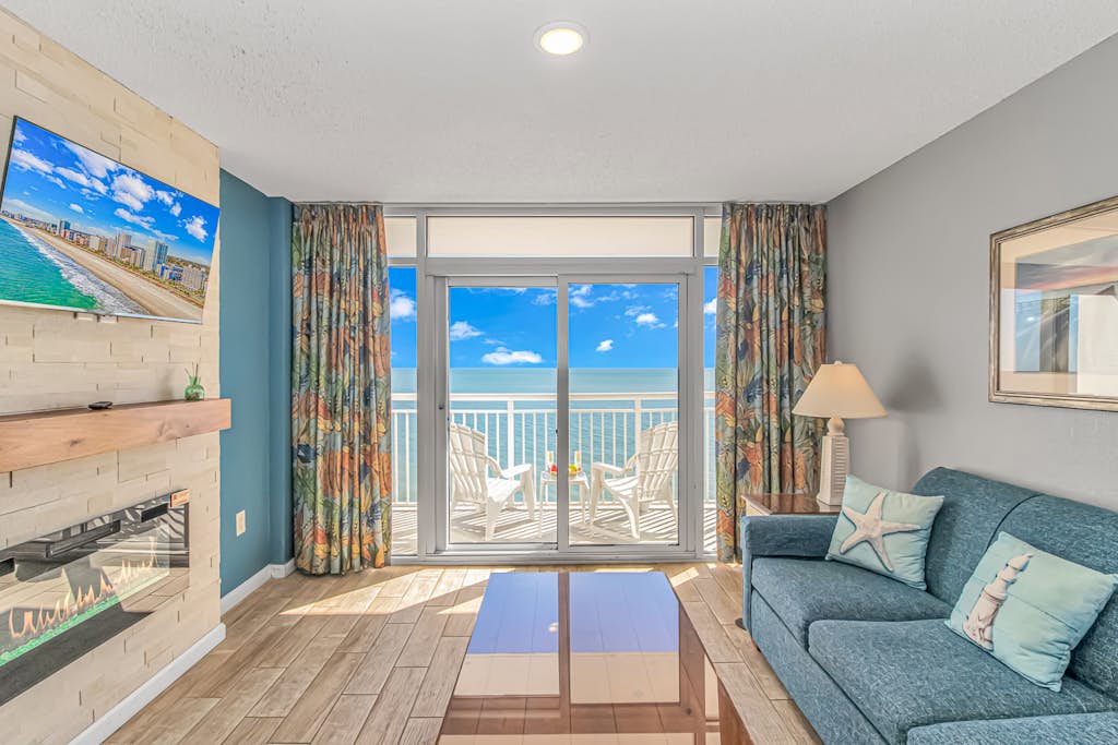 Making our way into the living room area, the endless, panoramic ocean views leave our guests speechless. Guests will love relaxing on the couch with a glass of wine by the new LED fireplace, and watching the sunset from the private balcony! The living space also features a murphy bed (wall mounted bed) making this 1 bedroom able to accommodate a total of 6 guests!