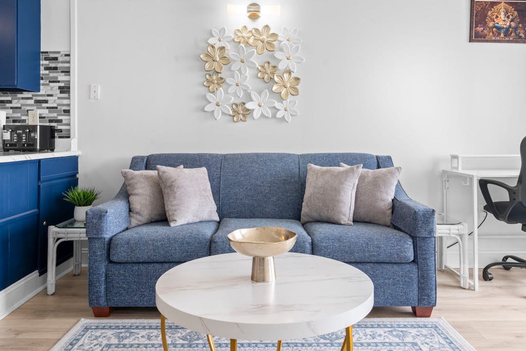Past the kitchen, the open-concept living and sleeping area invites you to settle in. A newly added sofa creates a cozy lounging space, accented by four plush pillows, a glass coffee table, and a soft area rug. The entertainment setup includes a new TV stand and a 55-inch Insignia smart TV, perfect for enjoying a night in. A new glass-top dining table with seating for four offers a great space for meals, remote work, or games. There's also a dedicated desk and chair for guests who need to get a little work done during their stay.