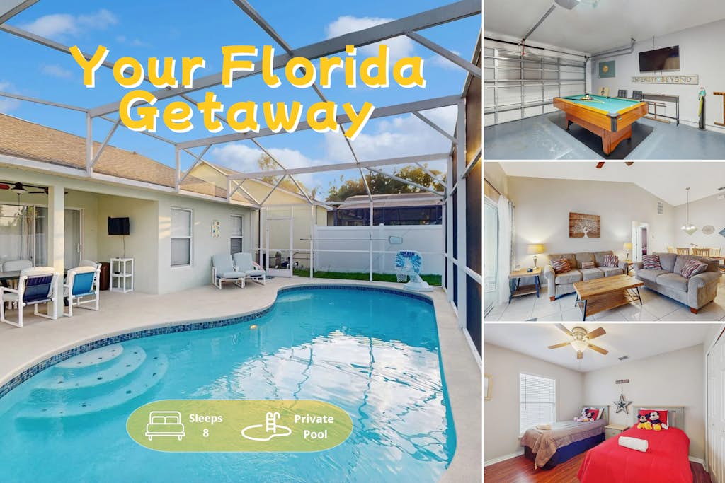 Enjoy the perfect Florida escape in this single-level home, just minutes from Disney, Universal, shopping, and dining. Relax in your private heated pool, unwind on the sunny patio, or enjoy endless fun in the game room with pool table, air hockey, and more. Inside, you'll a cozy living area, and a fully equipped kitchen with everything you need for easy meals.