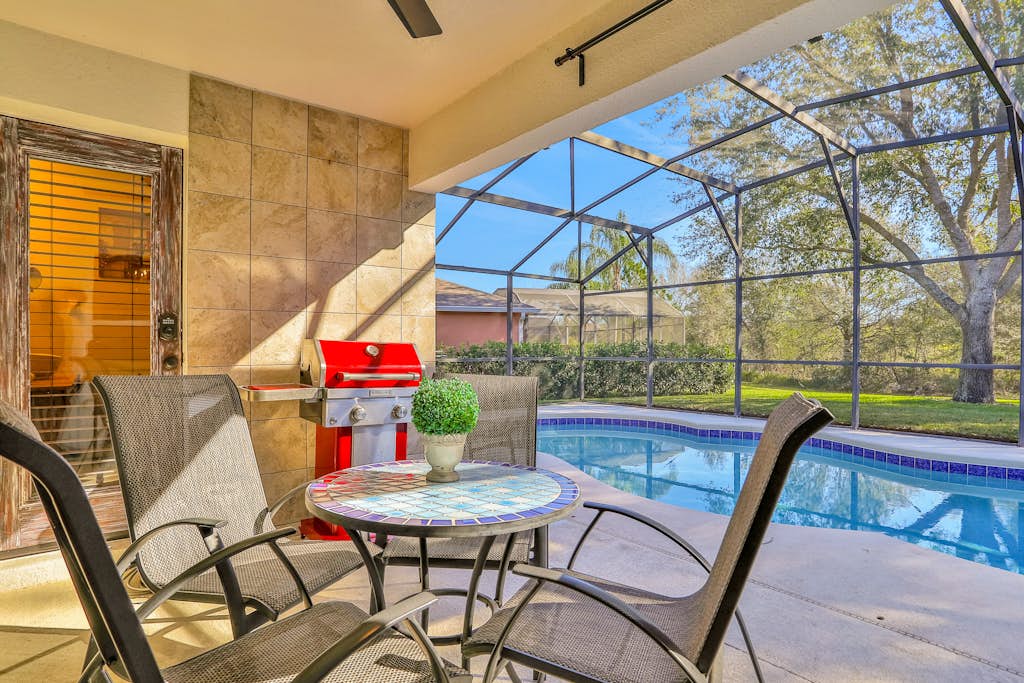 A true focal point of the home is the gorgeous enclosed patio. Equipped with a pool, grill, and a comfortable seating area, this space is begging to be enjoyed! Also during your stay, start your mornings with peaceful walks around the community park and pond, chatting with those you love as you plan the day's agenda.