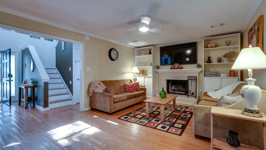 Inside, you'll find a formal dining room with a large table to your right, perfect for family meals. Walking straight ahead, you'll enter the living room, featuring a queen-size sleeper sofa and a large flat-screen TV with Roku. Double doors open to a spacious covered porch, along with plenty of open-air deck space and a fenced backyard, ideal for kids and pets.