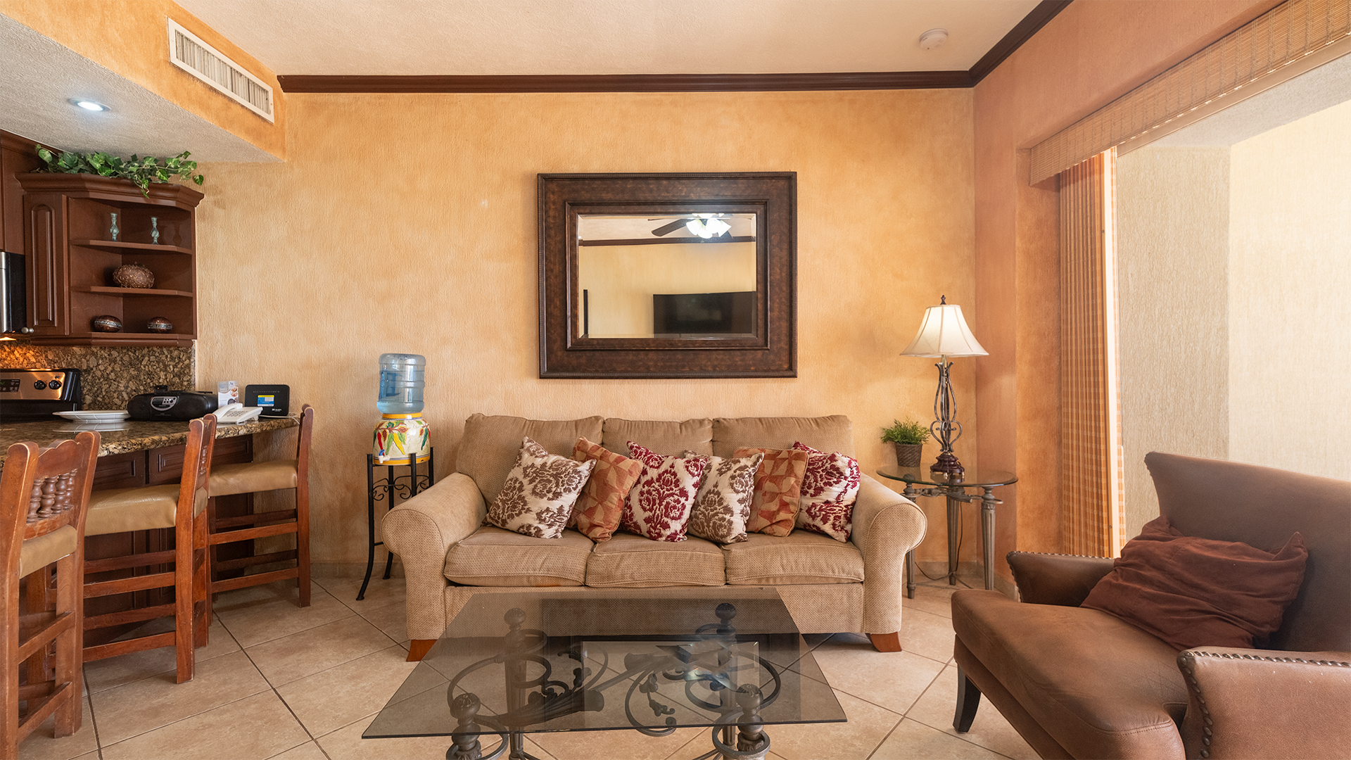 This beautiful condo is located on the 4th floor of the resort. This condo can accommodate up to 4 guests; two in the bedroom and two on the pull out sofa in the living room. The living room of this unit has walls that are finished in soft yellow Venetian plaster. The sofa is shiny tan leather and the pillows are shades of beige, khaki, and tan. Off to the side, there is a seafoam green armchair and in the center, there is a glass top coffee table and a queen size sofa sleeper. Beneath the coffee table, there is a handwoven Oriental rug in a floral pattern. Above the sofa, there is a large mirror that makes the room feel very open and spacious. A sliding glass arcadia door will take you out to your private terrace where you can enjoy the sunrise or sunset over the Sea of Cortez. The living room has a flat-screen plasma TV, DVD, VCR, and a stereo system. The condo has no formal dining room but there is seating on the bar stools butted up to the wet bar off the kitchen. The kitchen has dark wood cabinets, stainless steel appliances, and granite countertops. This kitchen has all the items you could possibly need to prepare a five-star meal. The master bedroom has a dark wood furniture suite which includes a king-size bed, bedside tables, dresser, and an attached mirror. In the corner of the room, there is a wall-mounted TV with a DVD player. The room has a window with a view of the ocean. The master bathroom has a single sink vanity and a walk-in shower made of marble. One wall of the bathroom is painted bright orange and the others are a Swiss coffee white.