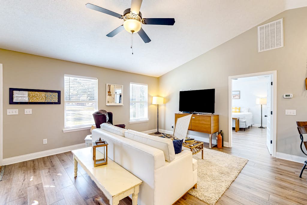 Sunlit dog-friendly Gulf retreat with patio & W/D - moments from beaches & parks is described as a great value and a perfect home away from home for families and groups, with spacious gathering areas and a welcoming, peaceful atmosphere. Guests found the home comfortable and inviting, with comfortable beds, an open layout, and a nice screened back porch that supports both weekend getaways and longer stays. The property is repeatedly praised as very clean, updated, and well stocked, with an exceptionally clean kitchen and bathrooms. Its location is highlighted as quiet and convenient, close to shops, restaurants, downtown, beaches, parks, and the bay while still feeling away from busy roads and crowds. Guests also appreciated the pleasant walk to the water for sunrise and sunset views. Amenities noted positively include a well-equipped kitchen, plentiful toiletries, a nice big TV, and useful laundry facilities.