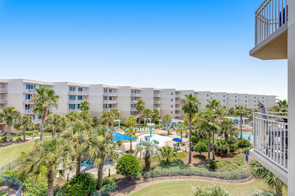 This condo has a wonderful view of Waterscape's tropical garden and oasis and a partial view of the Gulf of Mexico. The living room opens up to a spacious balcony with outdoor seating. The unit is beautifully decorated with warm tones of green and red. The condo's kitchen is well appointed with granite countertops, stainless steel appliances, and beautifully tiled floors. All dishes, cooking utensils, and bake ware are provided to complete and serve meals. There is a quaint round dining table with seating for four in the breakfast nook. This lovely home offers a full bath with a stand-up shower and a washer/dryer off of the kitchen. The open living room houses a queen sofa bed, TV, and DVD player, as well as a set of bunks to allow for flexible and additional accommodations. The primary bedroom features a king bed, private bath, TV, DVD player, and spacious closet.