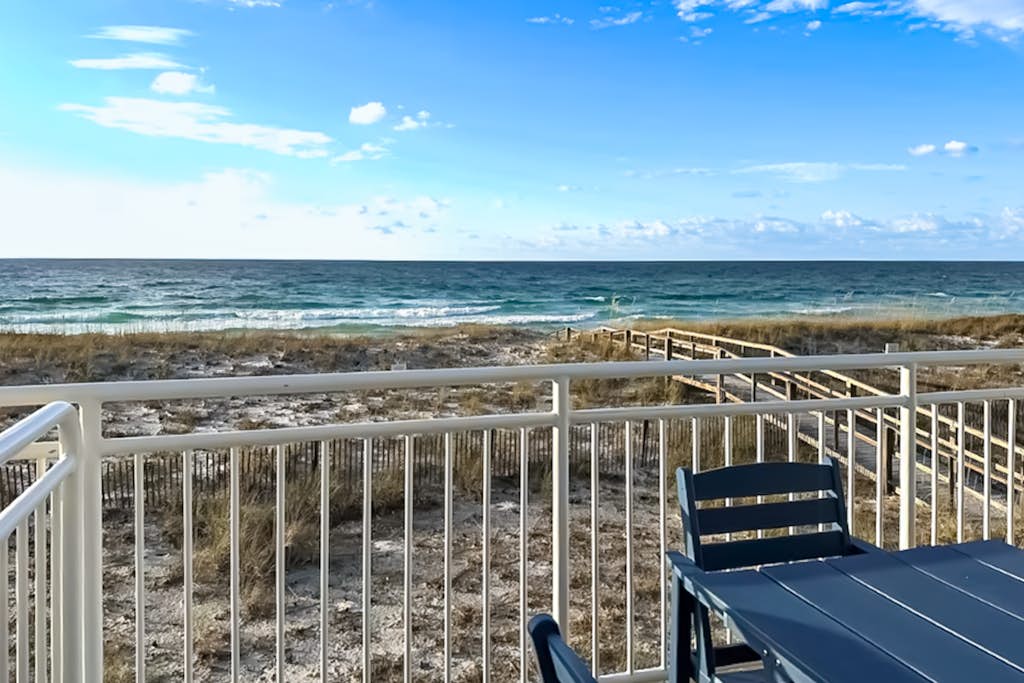 As you step inside, you’ll be greeted by a bright, beachy design that seamlessly blends comfort with coastal chic. Floor-to-ceiling windows frame breathtaking Gulf views on both levels, allowing you to watch dolphins dance across the emerald waters while sipping your morning coffee or evening cocktail. The open living space flows onto a breezy balcony, where the soothing sound of waves becomes your daily soundtrack.