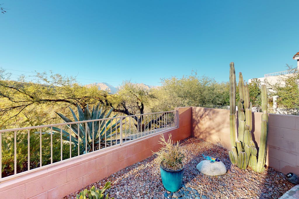 The outside patio has a nice seating area and view of the Catalina Mountains