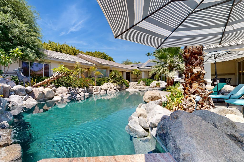 Spanning 6,600 square feet of luxurious living space on an acre of lush land, this upscale property is comprised of the main house and a casita. To compliment the resort feel, you'll find abundant entertaining space - enjoy two living areas, and a fully equipped bar with a pool table. Outside, a tropical oasis awaits with a lagoon-style pool with a heating option, two spas, a putting green, an outdoor kitchen, and a firepit.