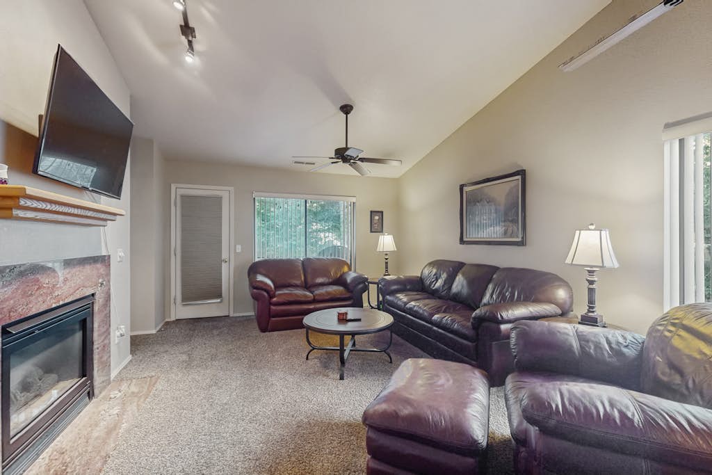 If you are looking for a year-round getaway from the hustle and bustle of the city, look no further than this charming, second-floor escape at Settlers Run. Start your mornings with coffee on the private balcony. Whip up your favorite breakfast in the pristine kitchen, which features a full suite of appliances, stone countertops, and a three-person bar. After fun-filled days, unwind with movie nights on the smart TV in the spacious living area, complete with high ceilings and a cozy gas fireplace. Additional perks of this family-friendly home include free high-speed WiFi and a private washer/dryer. A wide variety of hiking trails are just a short drive away, and winter sports enthusiasts will love being within easy reach of the slopes at Arizona Snowbowl.