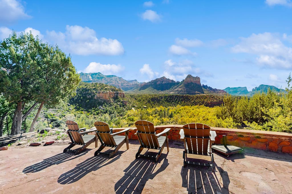 Spectacular View is described as a beautiful, spacious, and unique home that feels private, peaceful, and ideal for groups and family gatherings. The property offers a comfortable layout with cozy living spaces, inviting bedrooms, ample room to spread out, and thoughtfully decorated interiors full of charm and character. Guests frequently noted that the home was clean, orderly, and well stocked, with a well equipped kitchen, helpful laundry facilities, outdoor seating areas, a fire pit, games, and excellent WiFi. Its location is praised for being quiet and secluded while still within easy walking distance of downtown shops, restaurants, galleries, hiking, and local attractions. The standout feature is the breathtaking panoramic scenery, with spectacular red rock and mountain views from nearly every room, patios, decks, rooftop spaces, and outdoor gathering areas. Guests also appreciated the stargazing, shaded outdoor nooks, gated privacy, ample parking, and the overall welcoming atmosphere that inspired many to return.