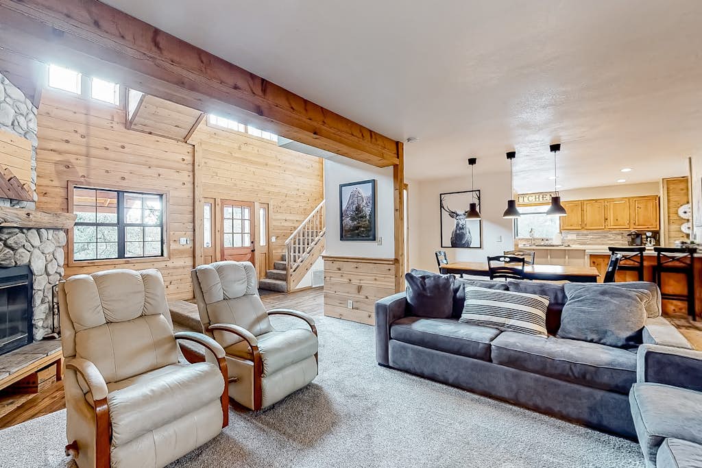At home, you'll love the peaceful mountain setting. Inside, the main living space features soaring ceilings, pine-paneled walls, and a mountain-modern vibe. The spacious, open kitchen features all the appliances and counter space you need to whip up mealtime masterpieces, and there's room for everyone at mealtime between the kitchen table and the large dining table.