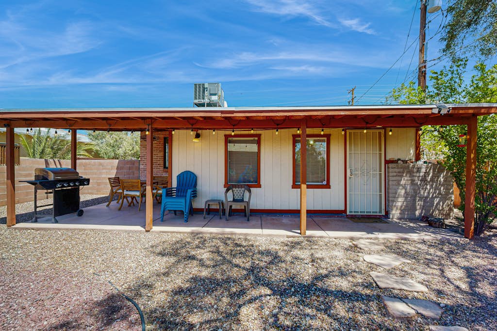 An excellent fusion of comfort and convenience, Sam Hughes offers a fantastic location within walking distance of popular restaurants and attractions. Additionally, you'll be only a mile away from the main entrance to the University of Arizona campus, as well as around 1.5 miles from downtown clubs and restaurants. This dog-friendly getaway features a sunlit interior with new furnishings, making for a clean and crisp atmosphere. Cozy up for movie nights on the smart TV in the living area or utilize the full kitchen to prepare delicious meals. The covered patio looks out into the fenced outdoor space and provides a gas grill and alfresco dining. Included family fun includes a corn hole set and a selection of board games. Added perks of staying at this Sam Hughes home include central air-conditioning, free WiFi, a private washer/dryer, and cable.
