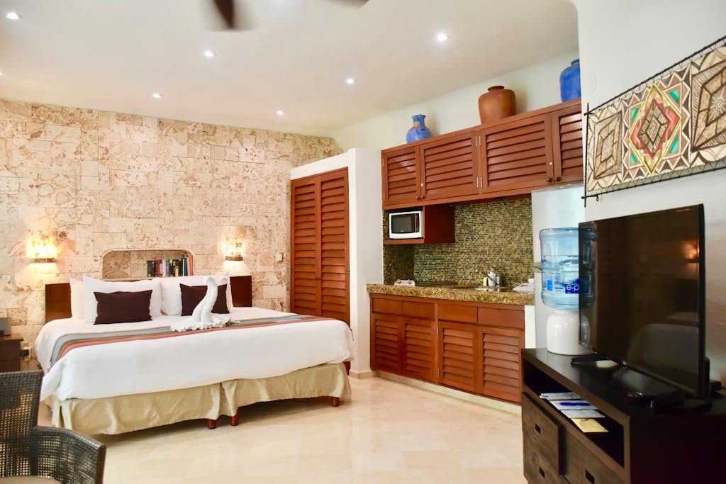 Our Partial Ocean View Studios are located on the ground floor overlooking a tropical garden and only steps away from the Caribbean sea and the pool. This room has one King size pillow top bed which it comfortably sleeps two people.