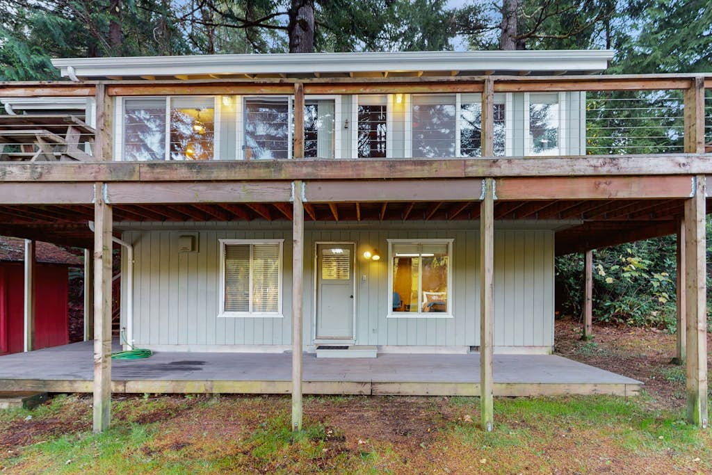 Rustic Retreat on Mercer Lake is described as a beautiful, relaxing, and spacious lakefront getaway that feels cozy, homey, and ideal for family time. The home is comfortable with inviting furnishings, updated furniture and bedding, comfortable beds, and plenty of space to spread out. Guests frequently found Rustic Retreat on Mercer Lake clean and well stocked, especially the kitchen with cookware, utensils, and essentials for cooking and dining. Its peaceful, private setting on Mercer Lake offers a quiet retreat that still provides convenient access to town and nearby coastal attractions. The property is especially praised for its stunning lake and forest views from inside and outside the home, including the deck and living spaces. Guests also appreciated the private dock, lake access, swimming and fishing opportunities, fire pit, deck, canoe, paddle boat, games, pet-friendly features, and available wifi.