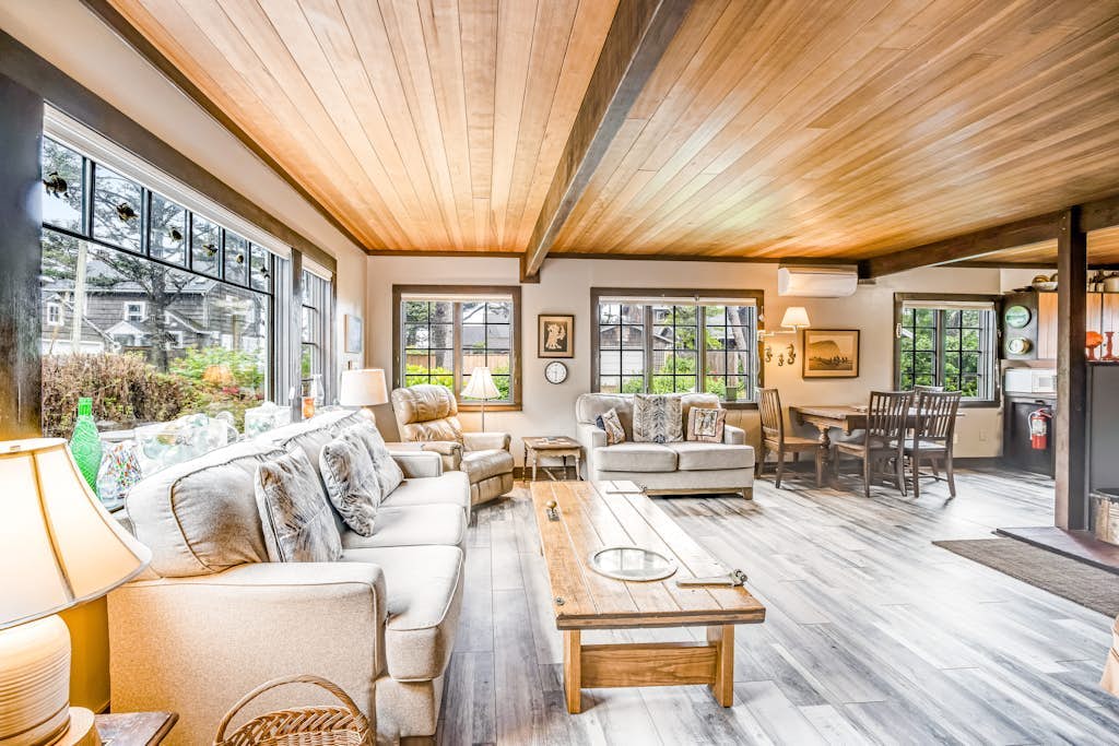 Historic Haystack Cabin is described as a charming, cozy, and comfortable beach retreat with a welcoming vintage character, spacious gathering areas, and a relaxing atmosphere that feels like home. The cabin is well furnished, thoughtfully stocked, and well equipped for cooking and beach stays, with comfortable beds, plentiful linens and towels, and inviting indoor spaces including a wonderful great room and wood stove. Guests frequently note that the property is very clean, spotless, and well maintained. Historic Haystack Cabin enjoys an excellent location just steps from the beach and within easy walking distance of town, shops, and restaurants, making it easy to leave the car behind. Guests also appreciate the ocean sounds, glimpses of the water, sunny deck, lovely garden, fenced yard, and easy beach access near Haystack Rock. Extra touches such as books, games, beach gear, laundry facilities, pet friendly features, and responsive management add to the appeal of Historic Haystack Cabin.