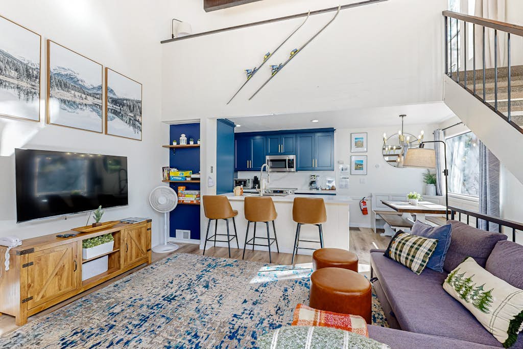 Relax in the living room equipped with a cozy sectional couch, perfect for evenings in after a day of outdoor adventures. Enjoy your favorite shows on the TV with cable and Netflix streaming, or step out onto the balcony to take in the fresh mountain air.