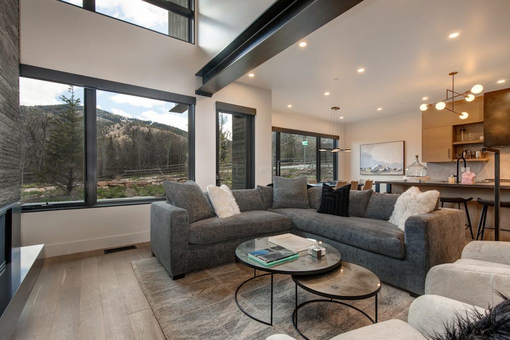 The home has three levels full of comfortable amenities and state-of-the-art decor and appliances. The first floor of the home hosts a private family room, a wet bar with a Sub Zero mini-fridge, and a secluded bedroom with an en suite full bath with a walk-in shower. The second floor hosts the main living space with an elegantly designed open floor plan featuring gorgeous exposed black beams, floor-to-ceiling windows, and terrific mountain views.