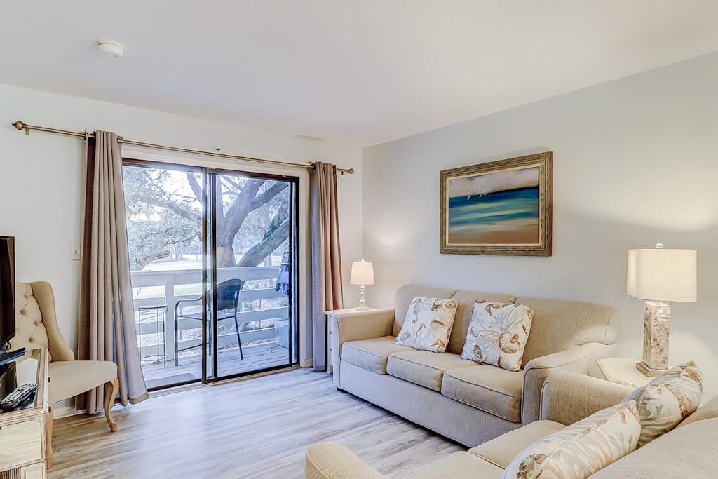 You'll find this completely renovated, second-floor condo and all its added perks just a half-mile from a beautiful Atlantic beach that will keep you coming back to Hilton Head. Guests of the Fiddler's Cove community have full access to an abundance of terrific amenities, including two pools, a hot tub, ten tennis courts, two racquetball courts, a gym, and a game room with a ping-pong table. And, of course, you'll be situated right on Barony Golf Course. The home's private balcony has a front-row seat to the tranquil fairway and surrounding oak trees draped in Spanish moss. Inside, you'll be treated to a bright interior with clean, coastal decor and colorful accents. If your vacation happens to come with a side of work, there's a dedicated working desk setup for all of your remote work or schooling needs, along with the high-speed WiFi to keep you connected. THINGS TO KNOW Tennis rackets and three beach chairs provided There is a queen-size sofa bed in the living area for extra sleeping options. Gated entrance with 24/7 security Snowbird-friendly