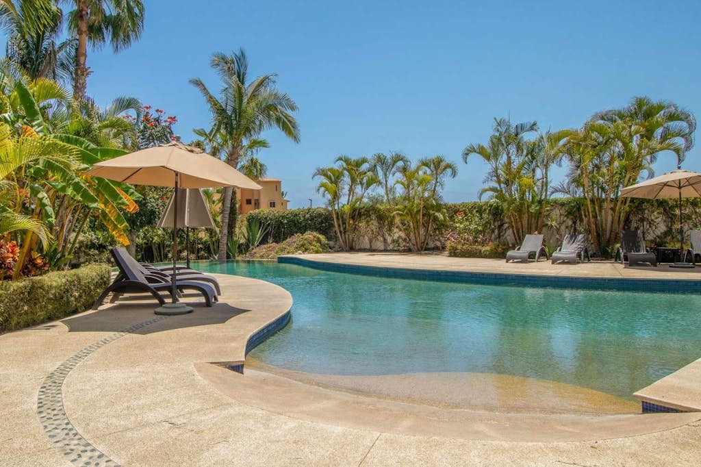 Luxury condo in Alegranza, San José del Cabo, featuring an open concept layout with a fully equipped kitchen, bright living area, and private terrace with partial ocean views. Comfortable bedrooms offer privacy and modern amenities. Enjoy a spacious private rooftop with lounge areas, pergola, and outdoor kitchen, perfect for relaxing or entertaining. Gated community with pools, tennis courts, gym, and prime location near beaches, dining, and golf.