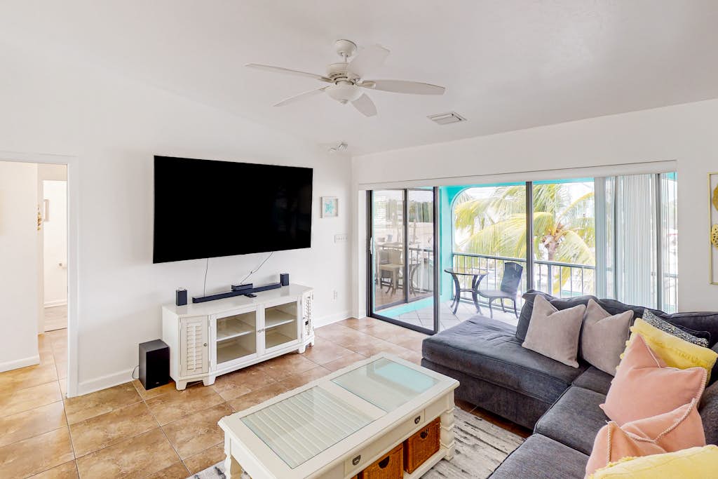 The home features a stilted interior with an open-concept layout designed with group gatherings in mind. Updated kitchen appliances are equipped to help you whip up island-inspired creations. Large smart TVs are equipped in the living room and each bedroom for flexible home entertainment.
