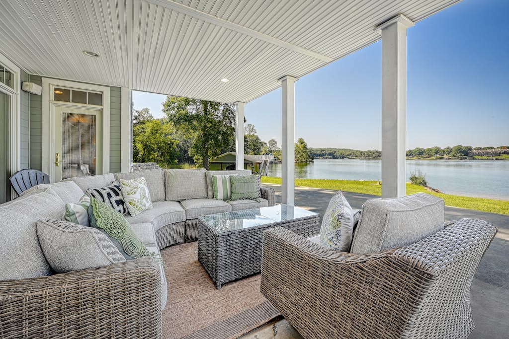 This family-friendly lakefront retreat enjoys three levels full of comfort, great amenities, hardwood floors throughout, and splendid water views. On the main level, which is located on the second floor, you will discover a beautifully decorated open floor plan that seamlessly combines all living spaces into one. Spread out comfortably in the living room, which offers a bookshelf full of entertaining books, water views, and a smart TV. Prepare culinary masterpieces in the well-appointed chef's kitchen, which features all GE Monogram appliances and a gas cooktop. Just outside of the dining area is a lovely seating area that is a perfect place to have morning coffee and relax as the calm lake readies itself for the day's activities. A larger outside porch off the living area is complete with rocking chairs to watch the sunset.