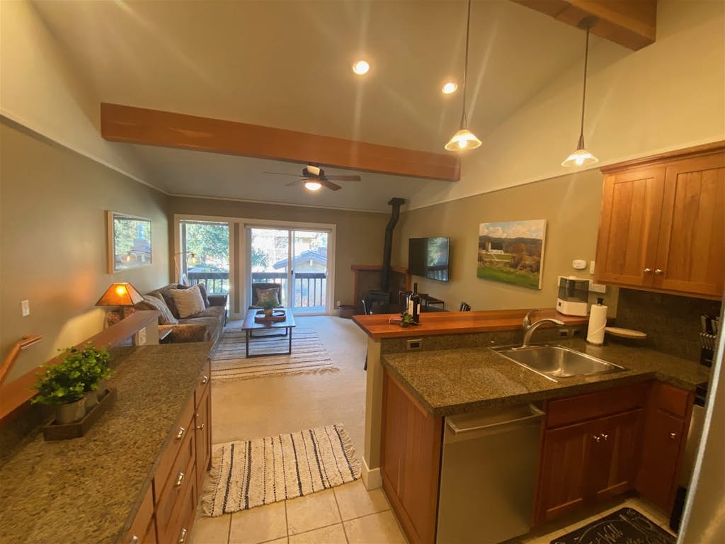 A perfect location and all the comforts of home. This 900 sq foot Val D' Sol condo features a reverse floor plan with a living area on the upper level of the home. The living area is open plan with a comfy sofa and occasional chair, a flat screen TV for indoor entertainment, and a traditional wood stove for cozy winter evenings at home. When you're not savoring the tastes of Sun Valley at a local restaurant, the modern kitchen is well-equipped for home cooked meals with a dining table for 4 and seating at the breakfast bar for 3.