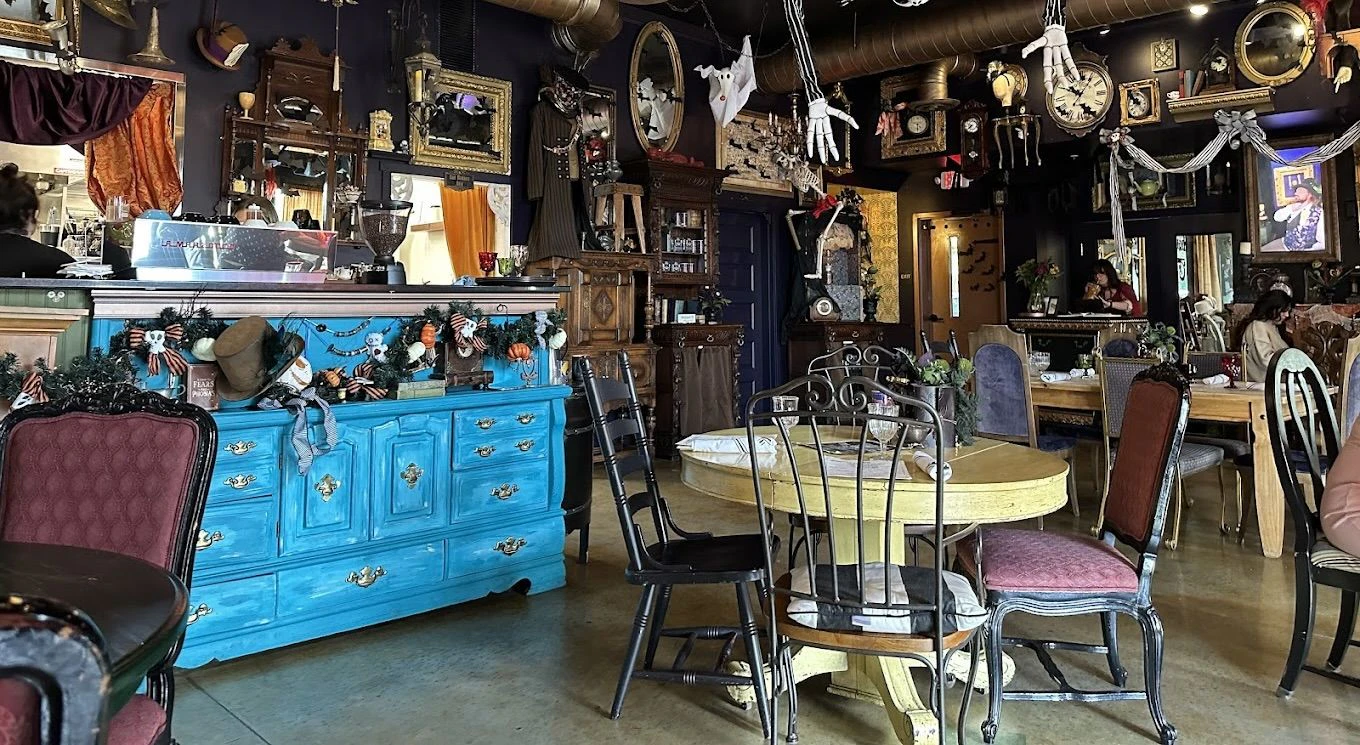 When you walk through the front door, the decor and vibe will take your breath away. Here, the room explodes into an eclectic storybook wonderland, with teapots bursting with red-tinged white roses on every table. The mismatched wooden chairs and tables, and the purple walls adorned with antique clocks and mirrors, add to the storybook setting.